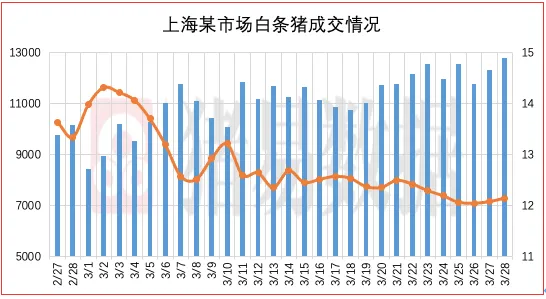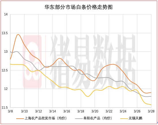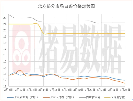 从今日北京、上海消费城市批发市场白条价格走势来看,北京、上海批发市场白条成交价格呈现跌涨调整,北京市场开磅价稳中伴跌0.2元/公斤,市场成交均价表现一般,市场走货速度表现一般;上海市场价格呈现稳中伴涨,部分市场成交价参考11.90-12.14元/公斤,到货量有所增加,市场交易情绪表现一般,市场成交均价表现一般。