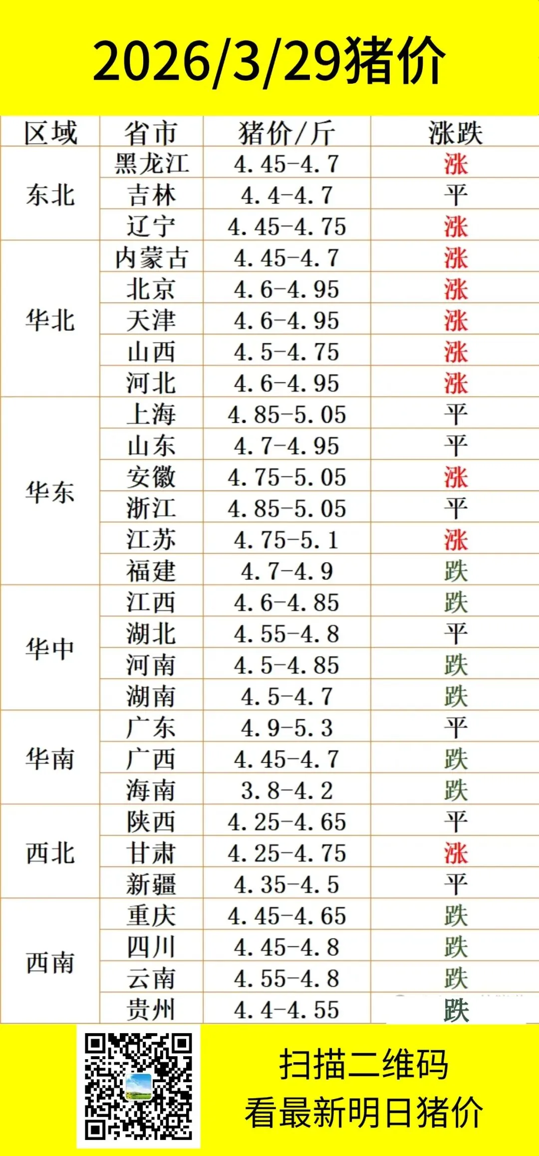 2026.3月29-明天猪价参考!(多地上涨!) 养羊网 2026-03-28 2026.3月29-明天猪价参考!(多地上涨!)战蓝套装,专门防控猪场蓝耳病的,可治疗可预防订购电话:18237123013(微信同步)如果你感觉有帮助,请您转发到朋友圈,让更多的养殖朋友看到做个参考! 养羊网 2026-03-28 上一篇:2026年3月28日 川渝鸡蛋价格参考! 下一篇:猪价跌穿7年新低!7块一斤的背后,千万养猪人在哭,致敬“猪”坚强 您可能还会对下面的文章感兴趣111: 相关文章 2026年1月13日鸡蛋价格参考 我宣布北京一块钱的鸡蛋已经灭绝 2025年4月13日全国各地生猪价格信息 近期价格更新!!!