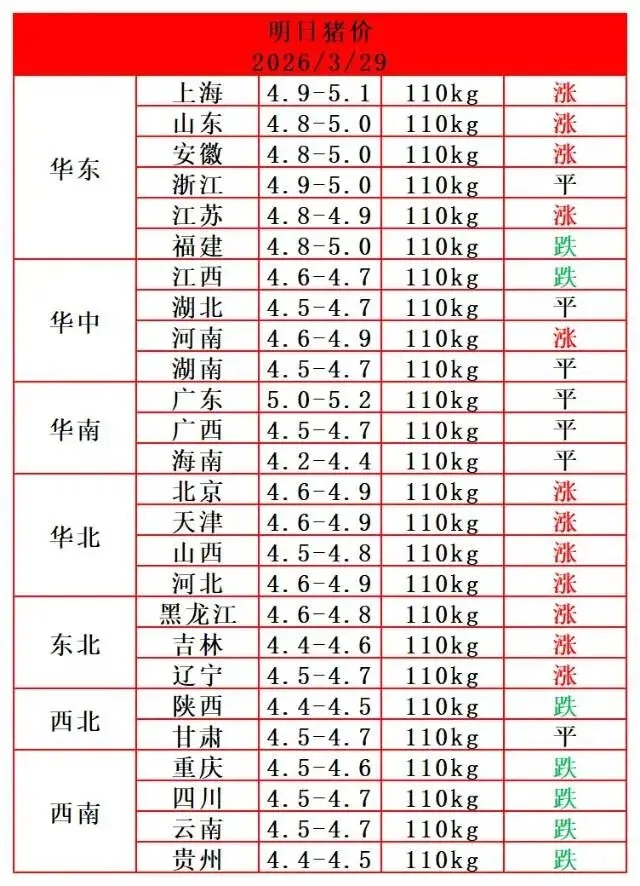 猪价波动行情2026.3.29全国猪价 养羊网 2026-03-28 猪价波动行情2026.3.29全国猪价 养羊网 2026-03-28 上一篇:春秋假来了、猪价跌破 5 元、博士后被逼到绝境:今天这份早报,比你想的要残酷也要现实 下一篇:猪价下跌,养一头猪亏500+ 您可能还会对下面的文章感兴趣111: 相关文章 (2月28日)鸡蛋价格最新报价 2026年3月13日(早间)鸡蛋价格行情参考 【鸡蛋价格】2026.3.5—最新鸡蛋价格 2026.1.2鸡蛋价格