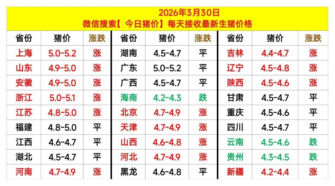 今日猪价|明天猪价分析2026.3.30 养羊网 2026-03-29 今日猪价|明天猪价分析2026.3.30关注我们,早点知道猪价 养羊网 2026-03-29 上一篇:【明天猪价】 2026. 03. 30 大面积上涨! 下一篇:2026.3.29全国鸡蛋价格最新报价行情参考,3.29鸡蛋价格今日价全国走势 您可能还会对下面的文章感兴趣111: 相关文章 生猪市场“跌”声一片,何时是尽头? 探店计划二十一之回味祥羊羔肉家常饭菜香 顾家家居餐桌和隔热垫组合 动物长肉必备苜蓿草