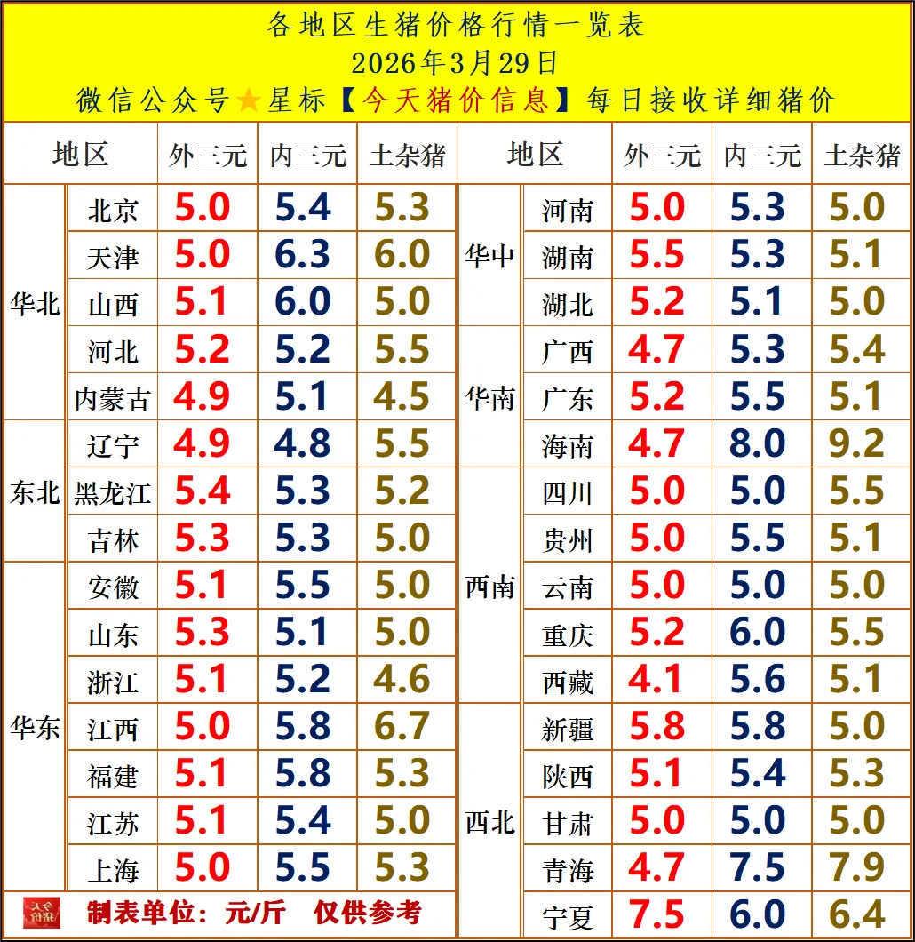 今日猪价 | 2026.3.30明天猪价行情分析!2026年03月29日猪价行情: 外三元:5.05元/斤,较昨日下跌0.10元 内三元:5.07元/斤,较昨日下跌0.17元 土杂猪:5.08元/斤,较昨日下跌0.02元