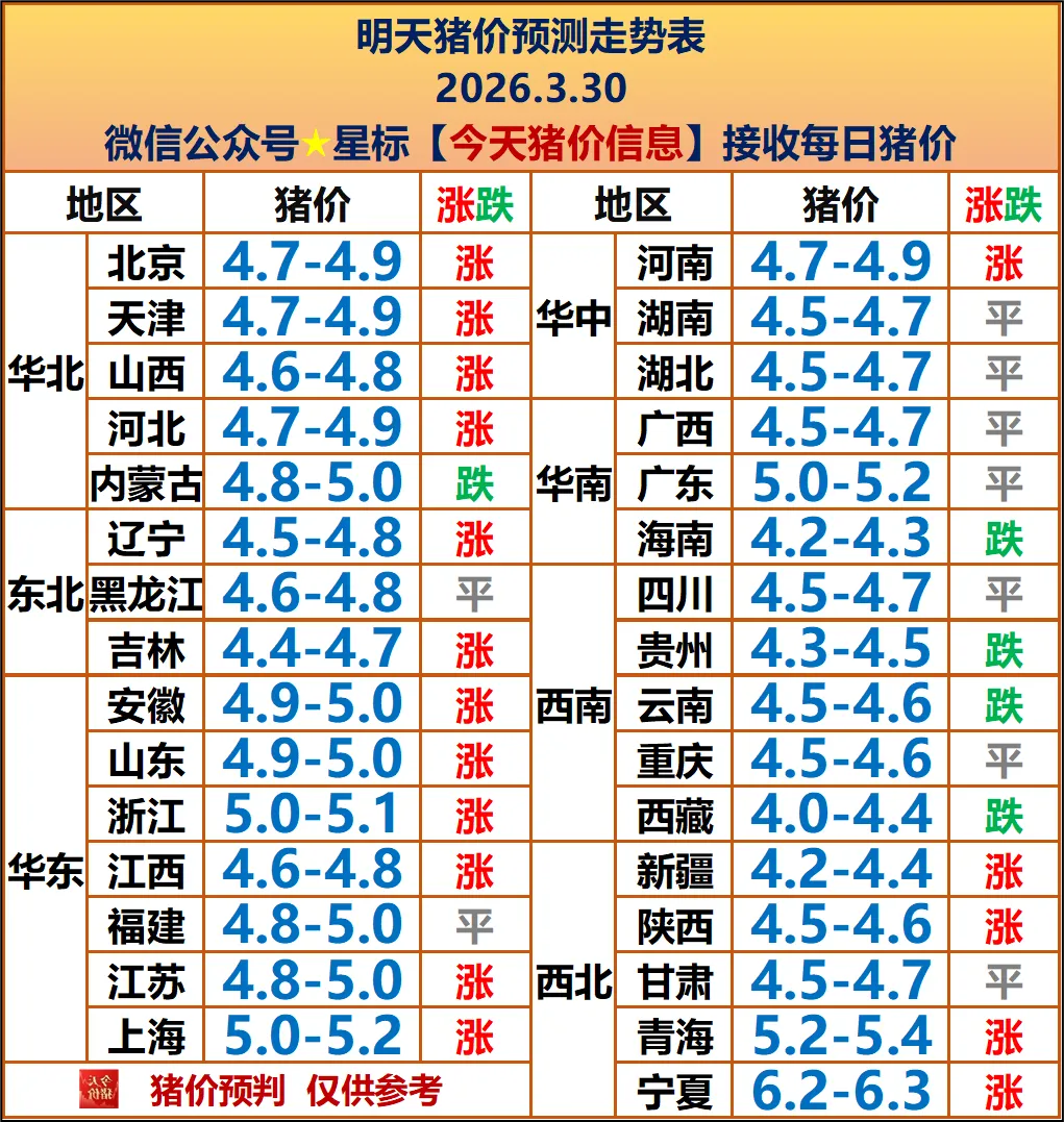 明天3 月 30 日全国猪价窄幅震荡、区域分化。北方多地小幅上涨,河南主流4.8-5.0 元 / 斤;南方部分地区偏弱,整体偏稳为主。市场供需博弈平衡,终端消费淡季,屠宰提价意愿弱。