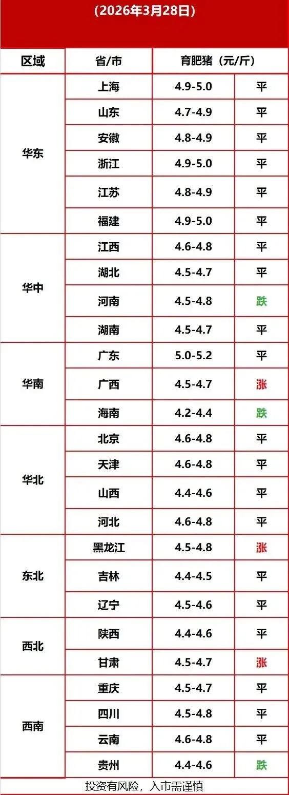 3月28日猪价 养羊网 2026-03-29 3月28日猪价每日猪价行情3月28日猪价点点赞推 荐 阅 读中东战火如何烧高我们的猪饲料?养猪人必看的成本预警!真金白银!温氏股份拟最高12亿回购,向市场释放最直接信号美国大豆想回中国餐桌?13%关税挡路,巴西笑了www.chinabreed.com中国养殖网编辑:郑高兴来源:中国养殖网、网络 养羊网 2026-03-29 上一篇:【猪价预测】3月31日 ~4月2日!全国猪价! 下一篇:【问猪病加我】2026.3.30-全国猪价:(好猪价.养好猪!) 您可能还会对下面的文章感兴趣111: 相关文章 5打雞蛋的價格 2025年4月13日全国各地生猪价格信息 近期价格更新!!! 近期价格更新!!!