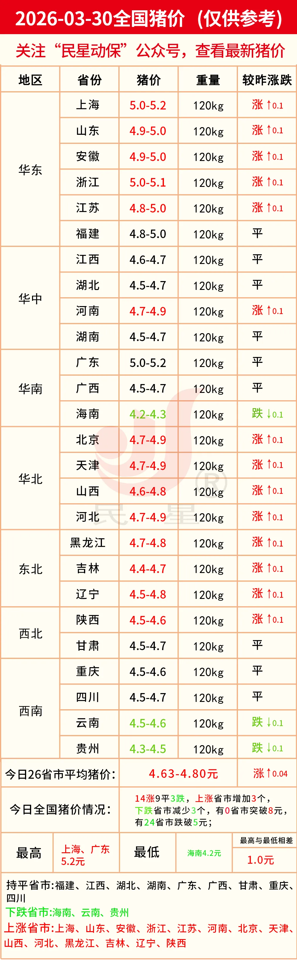 明日猪价—2026年03月30日(全国最新生猪价格) 养羊网 2026-03-29 明日猪价—2026年03月30日(全国最新生猪价格) 养羊网 2026-03-29 上一篇:2026年3月30日 全国猪价 下一篇:猪价“冰火两重天”!2月屠宰量增40%,猪企巨亏,吃肉自由来了 您可能还会对下面的文章感兴趣111: 相关文章 近期价格更新!!! 【明天猪价】2026.02.28全国猪价 (猪价上涨不要停!) 22.9r!鸡蛋不碎真香??? 近期价格更新!!!