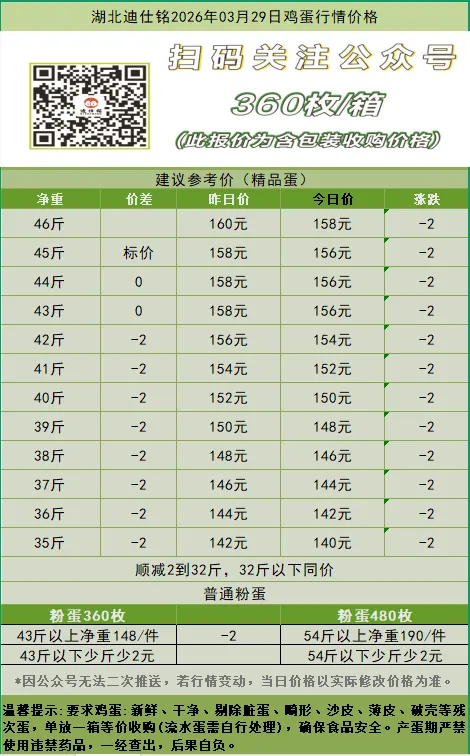湖北迪仕铭2026年03月29日鸡蛋行情价格 养羊网 2026-03-29 湖北迪仕铭2026年03月29日鸡蛋行情价格 养羊网 2026-03-29 上一篇:3月29日全国猪价止跌回暖,北方领涨【动力猪价】 下一篇:猪价大预测】3月31日~4月1日!全国猪价! 您可能还会对下面的文章感兴趣111: 相关文章 2025年4月13日全国各地生猪价格信息 明日(2月5日)鸡蛋价格预测 2025年4月13日全国各地生猪价格信息 近期价格更新!!!