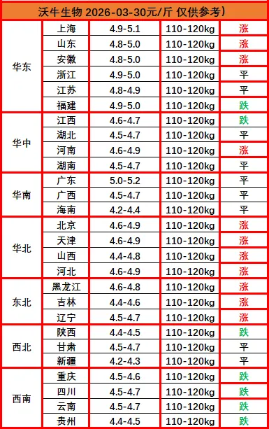 ? ?猪价播报沃小牛,助力养猪牛牛牛!各位养猪的老铁们,大家好!我是沃小牛,明天是2026年03月30日,最新猪价已经出来了:明天全国猪价涨面扩大,开年来猪价首次较大面积回暖,北方主产区领涨,南方局部跟涨,市场情绪显著提振。本轮上涨核心源于主产区惜售、调运需求增加及局部疫病导致出栏减量,属于供给端短期收缩驱动的修复行情。从持续性看,当前消费仍处淡季,大肥猪出栏压力未完全释放,冻品库存仍处高位,缺乏全国性消费利好支撑,预计短期维持窄幅震荡偏强,难现持续大幅上涨。清明假期消费或带来短暂脉冲,但难以改变整体低位运行的周期底色。
