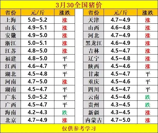 2026.3.30——明日猪价预测 养羊网 2026-03-29 2026.3.30——明日猪价预测 养羊网 2026-03-29 上一篇:2026年3月30日猪价信息 下一篇:3月29号 最新鸡蛋价格速查 您可能还会对下面的文章感兴趣111: 相关文章 美国鸡蛋价格暴跌,这对消费者来说是个大好消息——对农民来说却是一场危机. 速看!2月 8 日猪价预测. 2025年4月13日全国各地生猪价格信息 2026.1.17日考鸡蛋价格继续上涨