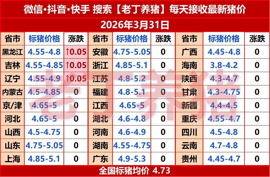 猪价有涨!【明天猪价】3月31日全国猪价涨跌表! 养羊网 2026-03-30 猪价有涨!【明天猪价】3月31日全国猪价涨跌表!关注老丁养猪查猪价·问猪病·卖好猪!看完点亮“推荐”支持老丁 养羊网 2026-03-30 上一篇:近七年新低,猪价跌至每斤5块多,专家:下半年有望好转 下一篇:涨涨涨!继续涨!猪价今日猪价行情价格表 | 2026.3.30最新今日表行情走势分析 您可能还会对下面的文章感兴趣111: 相关文章 身价涨了 敢拿鼻孔看人了! 云南鸡蛋价格参考:3月23日! 清纯仙女笨蛋大美人×温柔内敛腹黑大老板 【猪价预测】2026年1月7日~2026年1月9日全国猪价!