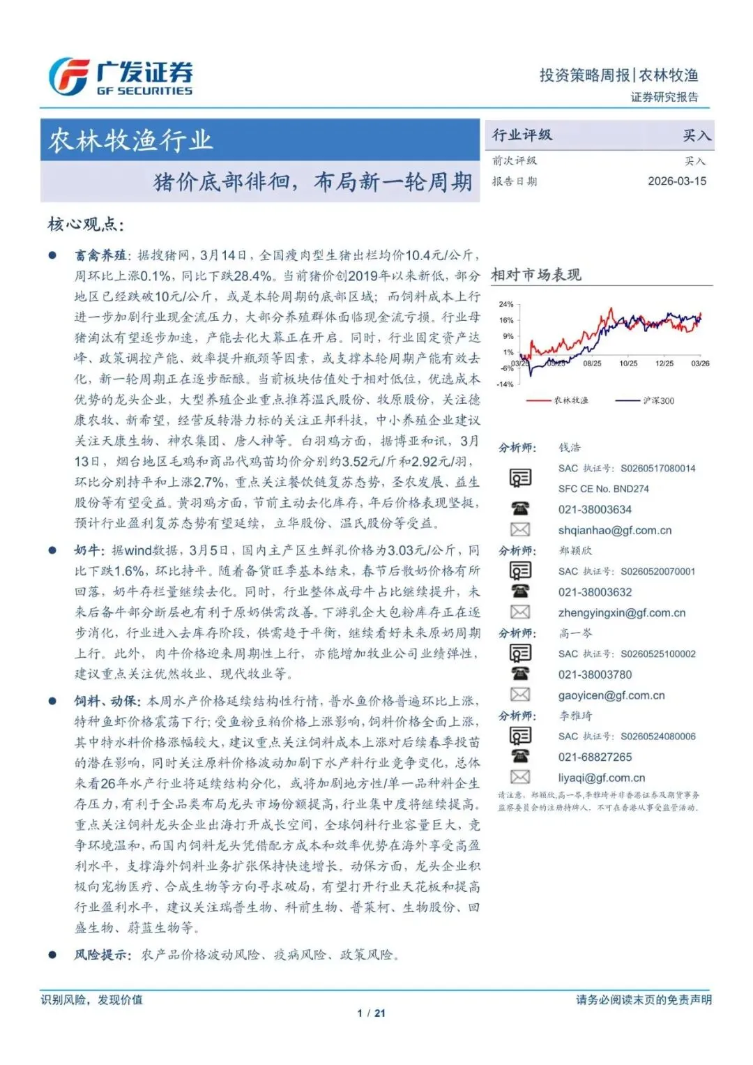 农林牧渔行业:猪价底部徘徊,布局新一轮周期-260315-广发证券-21页
