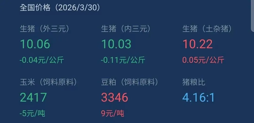 一、今天(2026年3月30日)全国生猪标准体重平均价格9.5-10.1元/公斤,同比昨日(2026年3月29日)价格上涨跌0.1元/公斤。