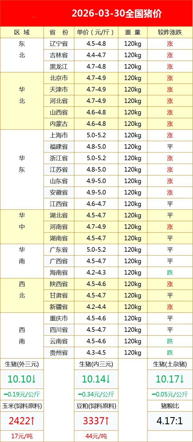 山东慧丰源3月30日猪价行情 养羊网 2026-03-30 山东慧丰源3月30日猪价行情 养羊网 2026-03-30 上一篇:突发!猪价创7年新低,每斤跌破5.5元!养殖户亏哭,普通人买菜爽了? 下一篇:三月猪价数据,四月猪价预测 您可能还会对下面的文章感兴趣111: 相关文章 2020.11福建省事业编资料2 二次育肥,在养猪行业还能继续吗? 奥克兰农场出小绵羊了 2025年4月13日全国各地生猪价格信息
