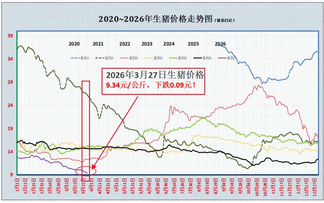 跌了,跌了,猪价下跌“跌猛了”!附:3月27日猪价时光飞逝,3月渐入中下旬,近期,国内猪价呈现“阴跌”不止的局面,市场利好支撑孱弱,供需基本面失衡,在产销错配影响下,猪价加速下跌!目前,国内生猪均价跌破9.5元/公斤,且,重心继续向下调整,猪价已经创下了近一二十年的低值。按照当前机构统计现货玉米均价在1.184元/斤,国内猪粮比降至3.98:1,生猪过度下降处于一级预警,养殖端陷入“腹背受敌”的阶段,亏损压力显著提升! 一方面,生猪报价持续下跌,猪价同比下降近36%,标猪报价跌入“4元时代”,养殖端亏损压力陡增; 另一方面,饲料成本居高不下,年初玉米行情高位运行,尤其是,山东多地玉米现货报价普遍在1.2~1.26元/斤,且,受国际地缘局势影响,豆粕行情走高,生猪育肥成本大幅上涨! 在猪价萎靡以及成本攀升下,当前,国内主流自繁自养头均亏损扩大至近300元左右,市场盼涨的情绪升温,但是,短期内,猪价仍将延续震荡下行的走势! 目前,支撑猪价下跌的逻辑,个人分析如下: 其一,春分过后,气温持续回升,这不仅抑制需求积极性,同时,加快了生猪育肥增重的节奏,对于生猪市场存在利空! 其二,去年5-9月母猪存栏高位运行,且,母猪产能效率显著提升,按照母猪存栏变化,机构预估2026年3-7月份,国内适重标猪供应宽松,产能处于释放阶段! 其三,消费进入积极性淡季,气温持续回暖,居民肉类需求明显转差,且,受饮食习惯以及替代品供应影响,猪肉购销持续冷清,下游白条出货不畅,屠宰场毛白价差持续偏低,头均亏损压力下,主流屠企多以销定产,增量开工积极性不高! 叠加,上月集团猪企出栏计划完成不佳,本月生猪出栏均重偏高,而标肥猪价价差不足,市场挺价信心不足,养殖端悲观情绪浓厚,认亏出栏现象较多! 因此,在供需变化下,猪价承压下跌,虽然,猪价重心下移,二育以及屠宰场分割入库对于市场存在潜在上涨的支撑,但是,目前,游资抄底入场谨慎,猪价仍处于磨底的阶段。 受供需变化,预计,3月27日,外三元生猪报价在9.34元/公斤,下跌0.09元,后市关注集团猪企出栏以及二次育肥入场情绪的变化。