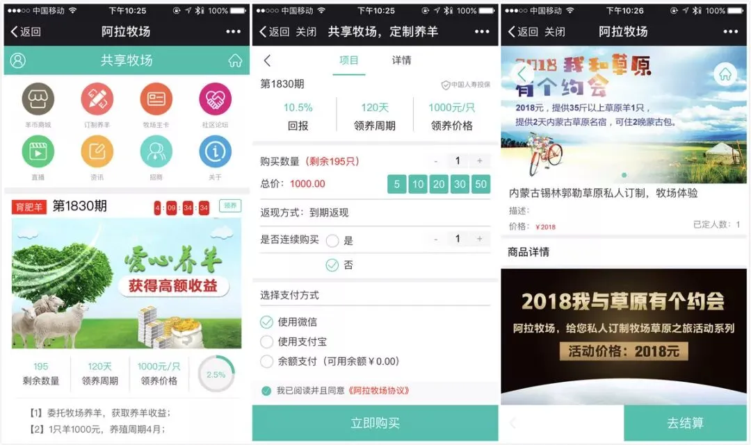 创始人兼CEO郭治国向36氪介绍,用户通过「阿拉牧场」平台可以向牧场主委托养羊,具体有两种模式:第一种偏向于投资行为,用户花1000元买一只小羊,由牧场喂养,4个月出栏后,用户可获得35元现金回报,收益率高于一般理财产品;第二种则更像消费行为,用户直接认领奶山羊,3000元/只,可以得到300元左右的纯羊奶粉,认领10只奶山羊获得的羊奶粉,够一人喝一年。到期后,养羊本金全额返还用户。