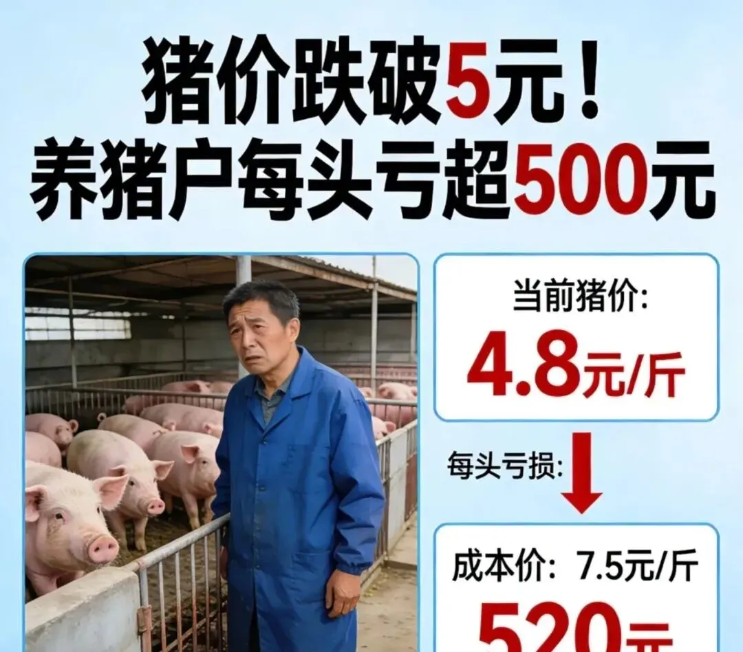 2026年3月,全国猪价集体跌破5元/斤,东北、新疆甚至低至4.3元/斤,创近7年新低。