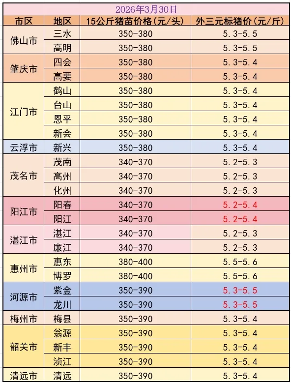3月30日猪价速递 养羊网 2026-03-30 3月30日猪价速递广东猪苗报340~400元,毛猪报5.2~5.6元,除阳江和河源微升外,其它地区价格稳定。(行情仅供参考) 养羊网 2026-03-30 上一篇:每日猪价|2026.3.31陕西稳 下一篇:2026.3.31明天猪价报价! 您可能还会对下面的文章感兴趣111: 相关文章 暴跌!借势是创业者破局的唯一途径! 种一亩小麦的成本思考 呼伦贝尔大草原 牛羊肉 60一斤 贵吗 3月28日全国南北涨跌互现【动力猪价】