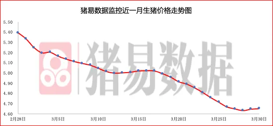 据猪易数据监测数据显示,2026年3月30日标准体重生猪平均价格为9.30元/公斤,较昨日猪价上涨0.01元/公斤,涨幅0.11%,同比25年同期14.54元/公斤下跌5.24元/公斤,跌幅36.04%。