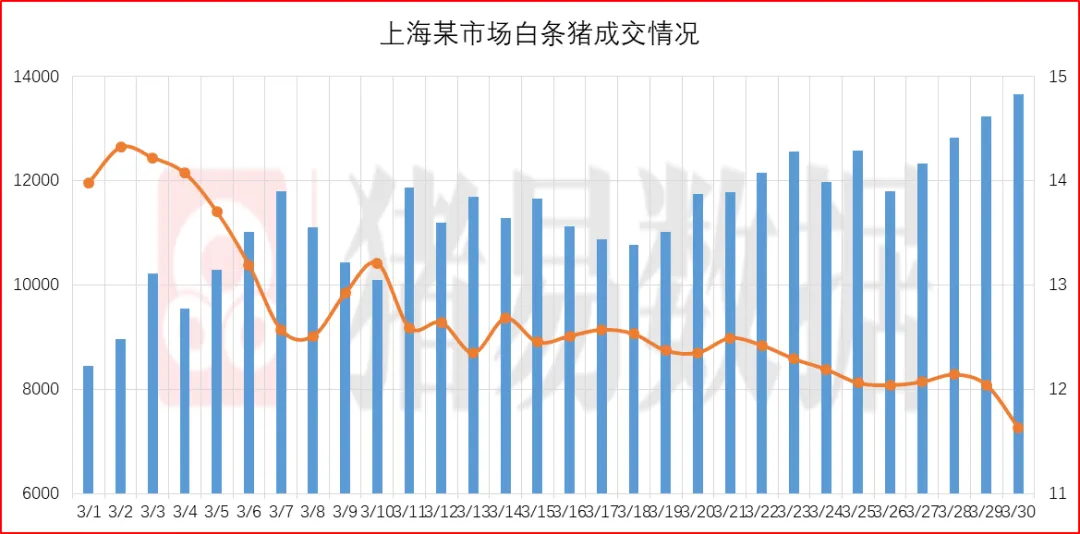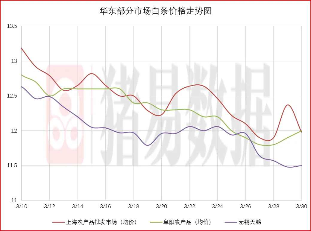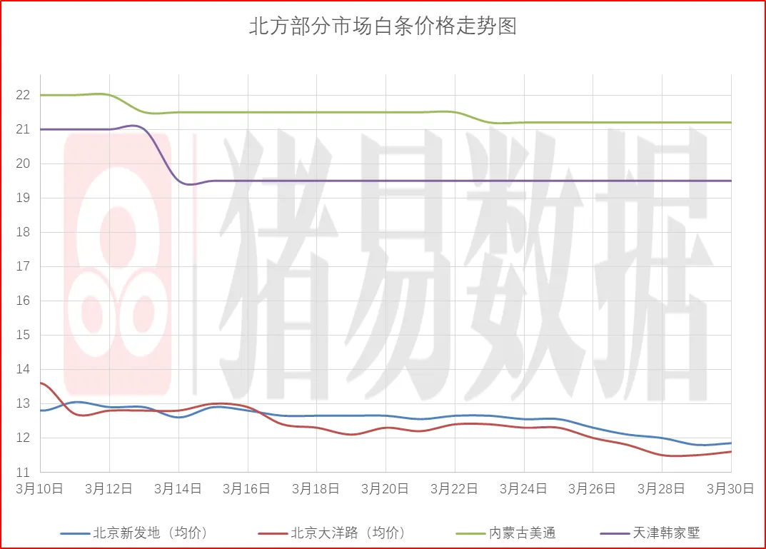 从今日北京、上海消费城市批发市场白条价格走势来看,北京、上海批发市场白条开磅价格呈现跌涨调整,北京大部分市场开磅价格维持稳定,市场走货速度表现一般偏好;上海市场价格呈现下跌,部分市场成交价参考11.63-11.98元/公斤,到货量表现有所增加,市场交易情况表现偏差,市场成交均价表现偏差。