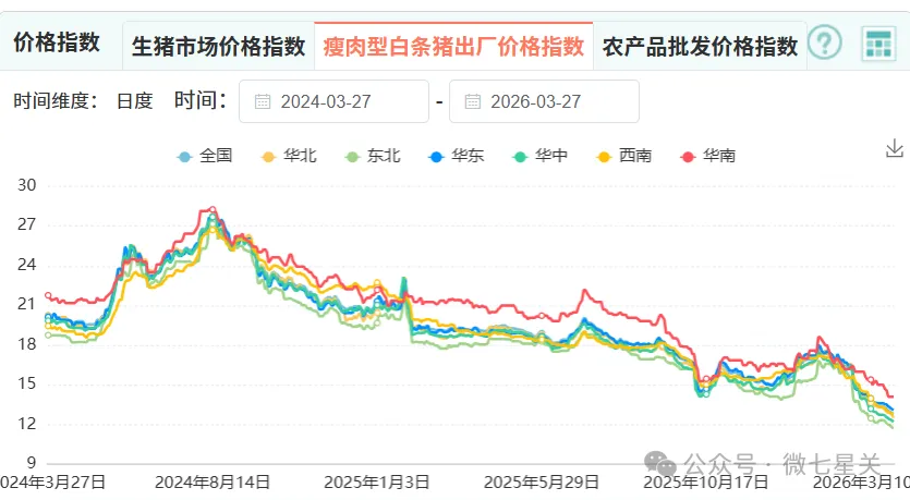 农业农村部全国重点农产品市场信息平台数据显示,截至3月27日,瘦肉型白条猪出厂价格指数已降至2024年同期以来新低。