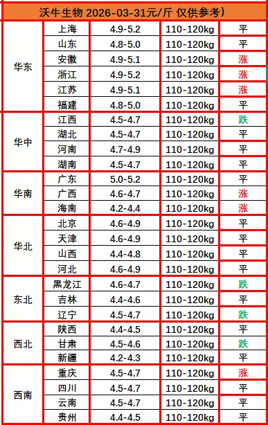 ? ?猪价播报沃小牛,助力养猪牛牛牛!各位养猪的老铁们,大家好!我是沃小牛,明天是2026年03月31日,最新猪价已经出来了:明天全国猪价呈现涨面收缩、区域分化的弱势格局,无省份出现连续上涨,上涨动力显著减弱。从盘面看,上涨省份主要集中在华东,单周涨幅普遍仅0.1-0.2元/斤,涨幅收窄明显;北方多数省份维持平稳,辽宁、甘肃、黑龙江、江西等省份出现下跌,市场缺乏统一上涨动能。当前猪价处于磨底阶段,核心矛盾仍是供给过剩与需求疲软的博弈。虽有政策收储托底,但终端消费未出现实质性回暖,屠企备货积极性不足,养殖户恐慌出栏与挺价惜售情绪交织,导致价格难涨易跌。短期猪价或维持低位震荡,难有大幅反弹。