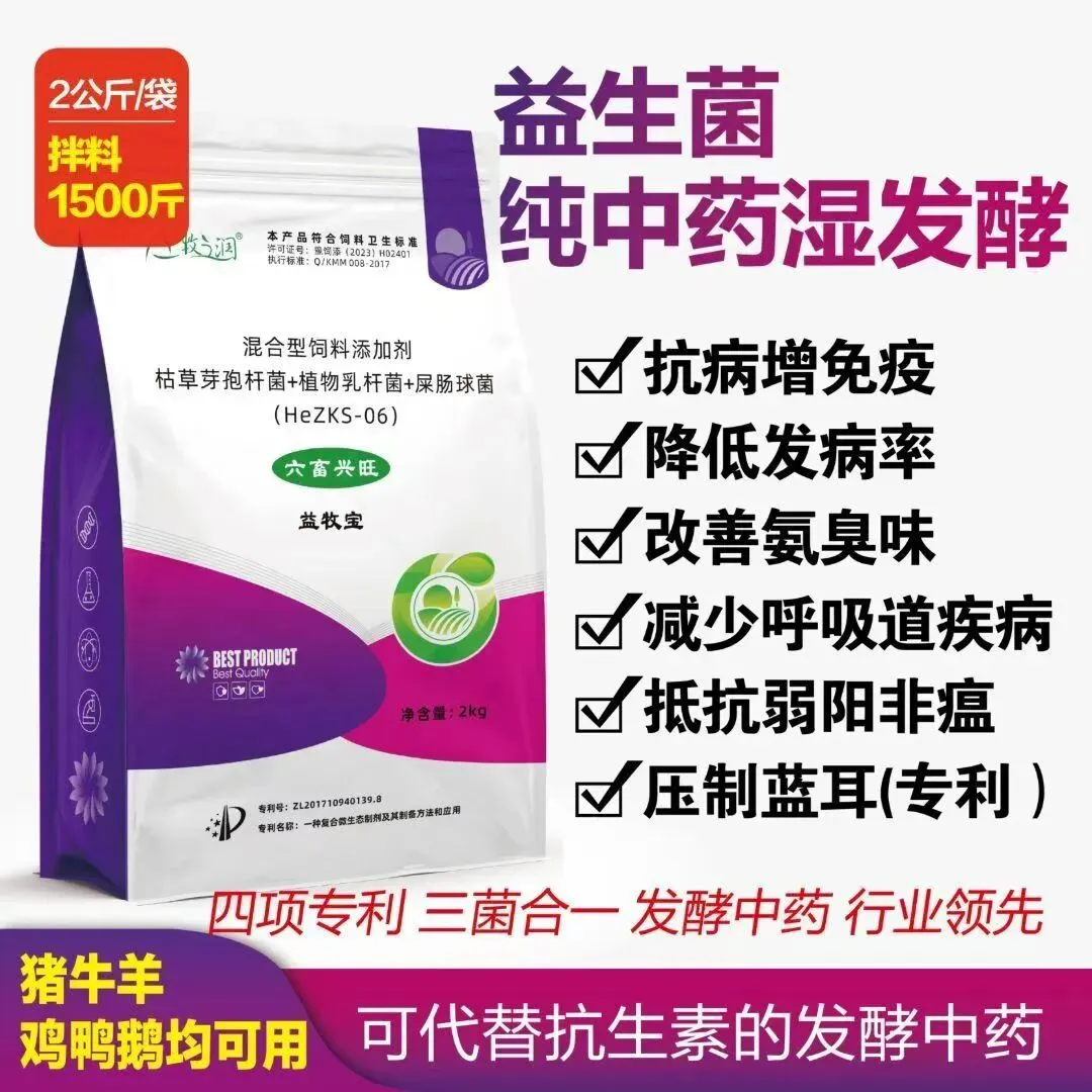 六畜兴旺益牧宝——国内菌药领导者! 益牧宝:为发酵中药专利产品,是发酵中药+活菌+代谢产物,具有中药的增强免疫力,抗病毒的作用,又有益生菌活菌的功效,不用肠道分解直接吸收,生物活性利用率可达100%吸收。 长期添加益牧宝就不需要再去添加益生菌,普通中药,脱霉净,多维等。 使用益牧宝还可有效减少养殖场氨气味,减少咳喘的情况并且会直观得感觉到氨气味降低,用药成本降低,长期添加,增强大群机体免疫力。