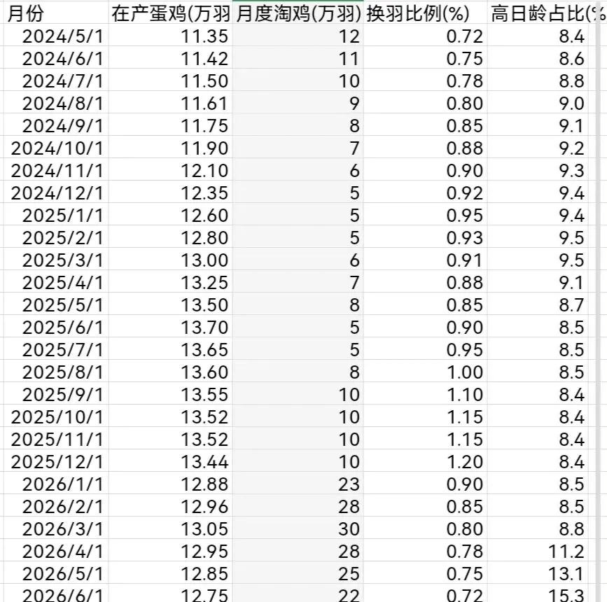 一、先看最核心的:在产蛋鸡存栏 从数据可以看到一个很清晰的趋势:2024年中开始,在产蛋鸡存栏一路往上走,从11亿多只,一直抬升到接近13亿只以上。这意味着什么?一句话:市场里的鸡,在过去一年是持续增加的。而鸡蛋这个品种有个非常典型的特点:供给决定价格,需求只是修饰。只要鸡在,蛋就会源源不断出来。 二、更关键的是:高日龄蛋鸡在累积