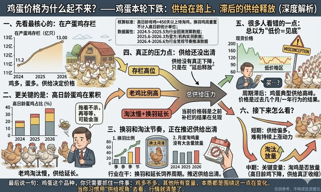 再看一个很多人容易忽略的数据:高日龄蛋鸡占比从2024年一路走到2026年,这个比例是逐步上升的,最近已经来到一个明显偏高的位置。这背后其实代表两件事:第一,老鸡淘汰节奏偏慢,第二,市场在“拖着不杀”。为什么不杀?因为价格不好,大家都有一个预期:“再等等,可能会涨”结果就是:该淘汰的没淘汰,供给被动延长 三、换羽和淘汰节奏,正在推迟供给出清 数据里还有两个关键变量:一个是换羽比例,一个是月度淘鸡量。你会发现:换羽比例在阶段性抬升,淘鸡节奏并没有明显放量,这说明什么?说明行业在干一件事:通过换羽和延长饲养周期,尽量“拖时间”但问题是拖时间的结果,不是减少供给,而是把供给往后挤。 四、真正的压力点:供给还没出清 如果把这几个数据合在一起看,其实结论很直接:在产蛋鸡存栏高位,老鸡比例偏高,淘汰节奏偏慢,换羽在延长生命周期,这四件事叠加在一起,指向一个核心:供给没有真正下降,只是在“延后释放”。也就是说,现在价格弱,并不是偶然,而是之前补栏的结果在兑现。 五、很多人看错的一点:总以为“低价=见底” 现在市场上有一个很常见的误区:看到价格低,就觉得差不多到底了。但在这种周期品里,低价不一定是底,很可能是供给高峰。鸡蛋尤其典型。因为从补栏到产蛋,是有周期的;从产蛋到淘汰,也是有滞后的。所以你现在看到的价格,其实是过去几个月甚至一年行为的结果。 六、接下来怎么看? 从这组数据推演一个比较合理的节奏:短期:供给依然偏多,价格难有持续性上涨动力,中期:如果淘汰开始加速,高日龄鸡下降,供给才会真正收缩。关键变量只有一个:淘鸡是否放量。 最后说一句,鸡蛋这个品种,研究复杂吗?其实不复杂。你只需要抓住一件事:鸡多不多,其他所有变量,本质都是围绕这一点在变化。当你习惯用“供给视角”去看,很多看似混乱的行情,其实都很清楚。 作者提示:本文仅为基本面梳理,不构成任何投资建议。市场有风险,投资需谨慎。