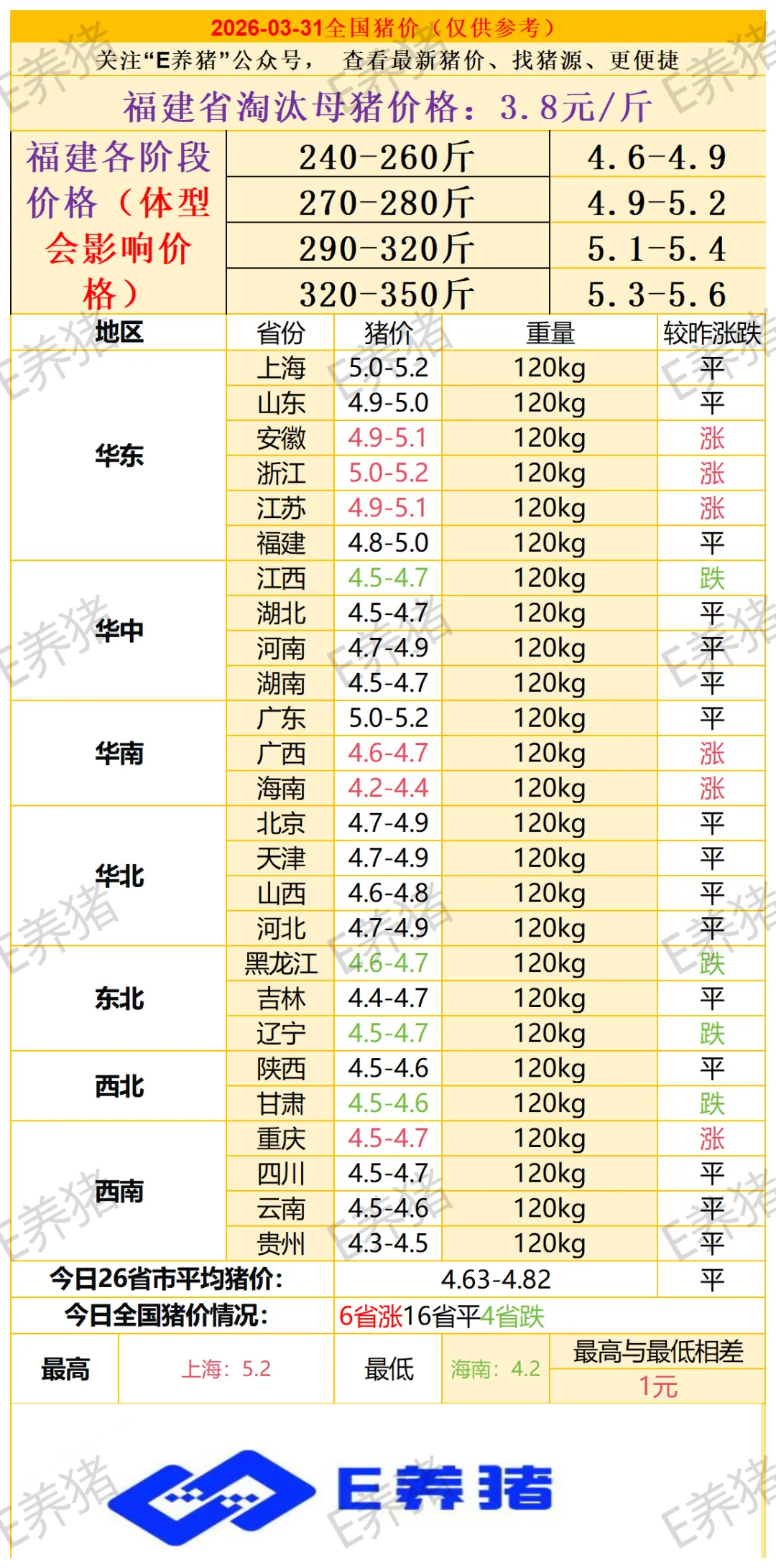 2026年3月31日猪价(均价未变)每日新增淘汰母猪价格、福建区域各阶段肥