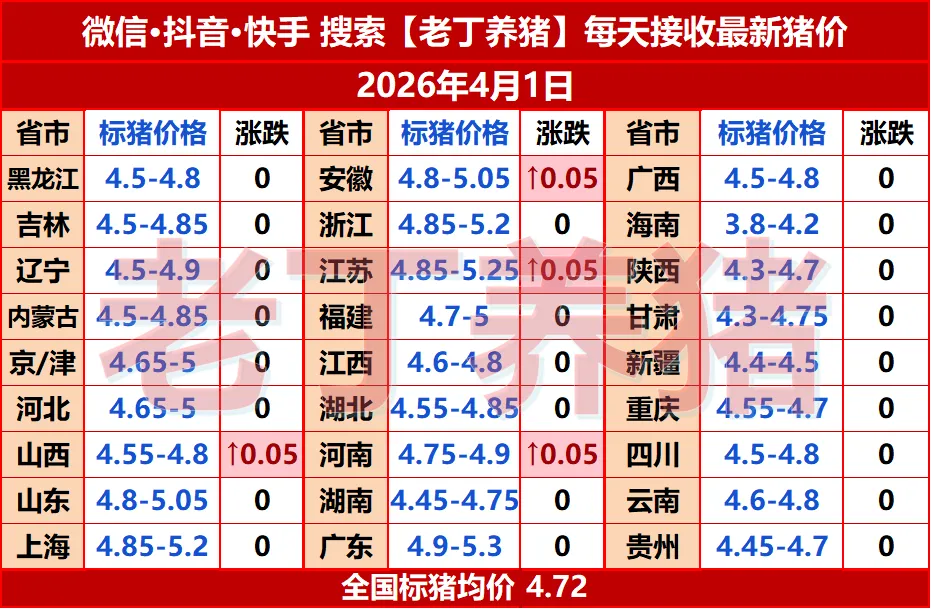 猪价有涨!【明天猪价】4月1日全国猪价涨跌表! 养羊网 2026-03-31 猪价有涨!【明天猪价】4月1日全国猪价涨跌表! 养羊网 2026-03-31 上一篇:猪价震荡走跌,养殖亏损持续加深 下一篇:【猪价预测】2026年4月1日~4月3日!全国猪价! 您可能还会对下面的文章感兴趣111: 相关文章 近期价格更新!!! 跌跌不休,生猪底在哪里? 工程利润 2026年3月2日-全国猪价