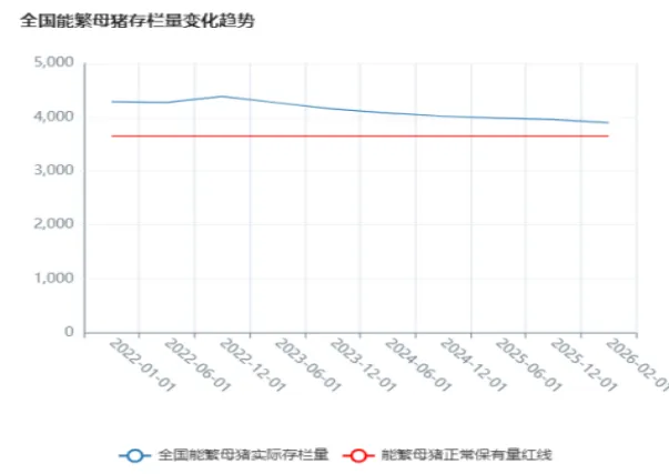图表2:全国能繁母猪存栏量vs调控目标走势(2022-2026年)