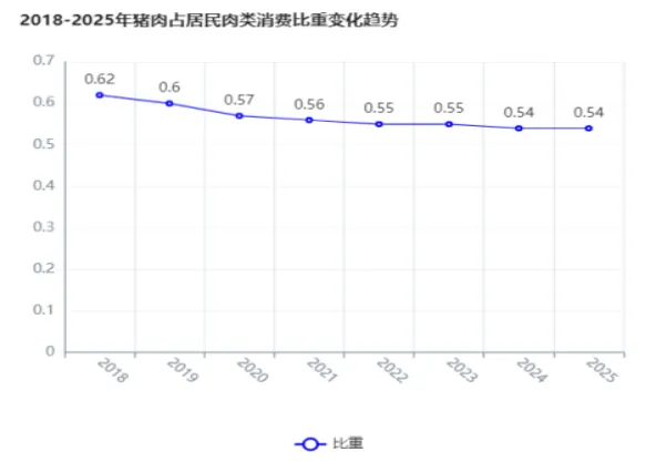 2018年,猪肉还占居民肉类消费的62.1%,到2025年,已经降到了54.2%,每年都在跌。
