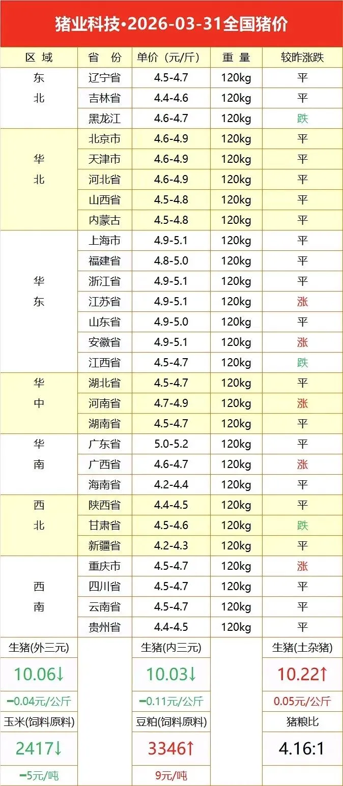 据农业农村部对全国500个县集贸市场及采集点监测数据,2026年3月第3周,每公斤仔猪26.2元,环比跌2.6%,同比跌30%;每公斤生猪11.05元,环比跌2.9%,同比跌28%;每公斤猪肉22元,环比跌2.1%,同比跌16.5%。