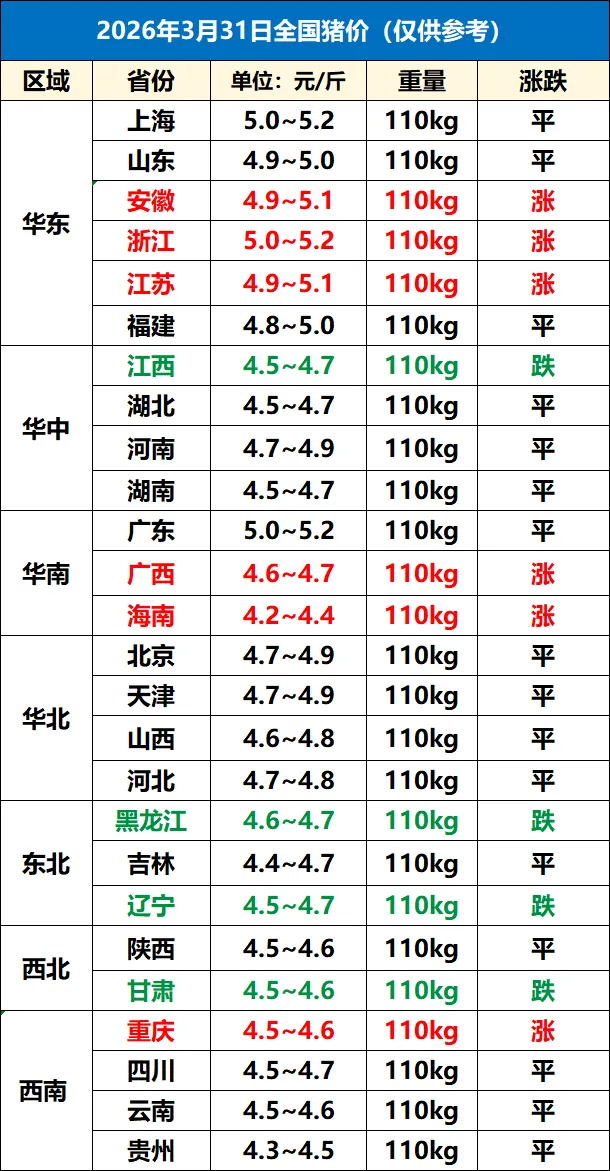 3月31日全国猪价一夜升温,“筑底”上涨! 筑牢生物安全,守护养殖底线.生物安全无小事,防非控险抓细节. 养羊网 2026-03-31 3月31日全国猪价一夜升温,“筑底”上涨! 筑牢生物安全,守护养殖底线.生物安全无小事,防非控险抓细节. 养羊网 2026-03-31 上一篇:2026.3.31猪价快讯--福州穗丰动保 下一篇:3月31号鸡蛋价格 您可能还会对下面的文章感兴趣111: 相关文章 2025年4月13日全国各地生猪价格信息 1月21日东莞信立农批鸡蛋价格 1-26-全国鸡蛋价格 近期价格更新!!!