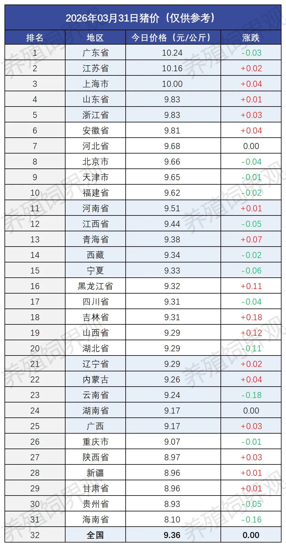 数据显示,3月31日,全国外三元生猪平均价格为9.36元/公斤,较昨日企稳。