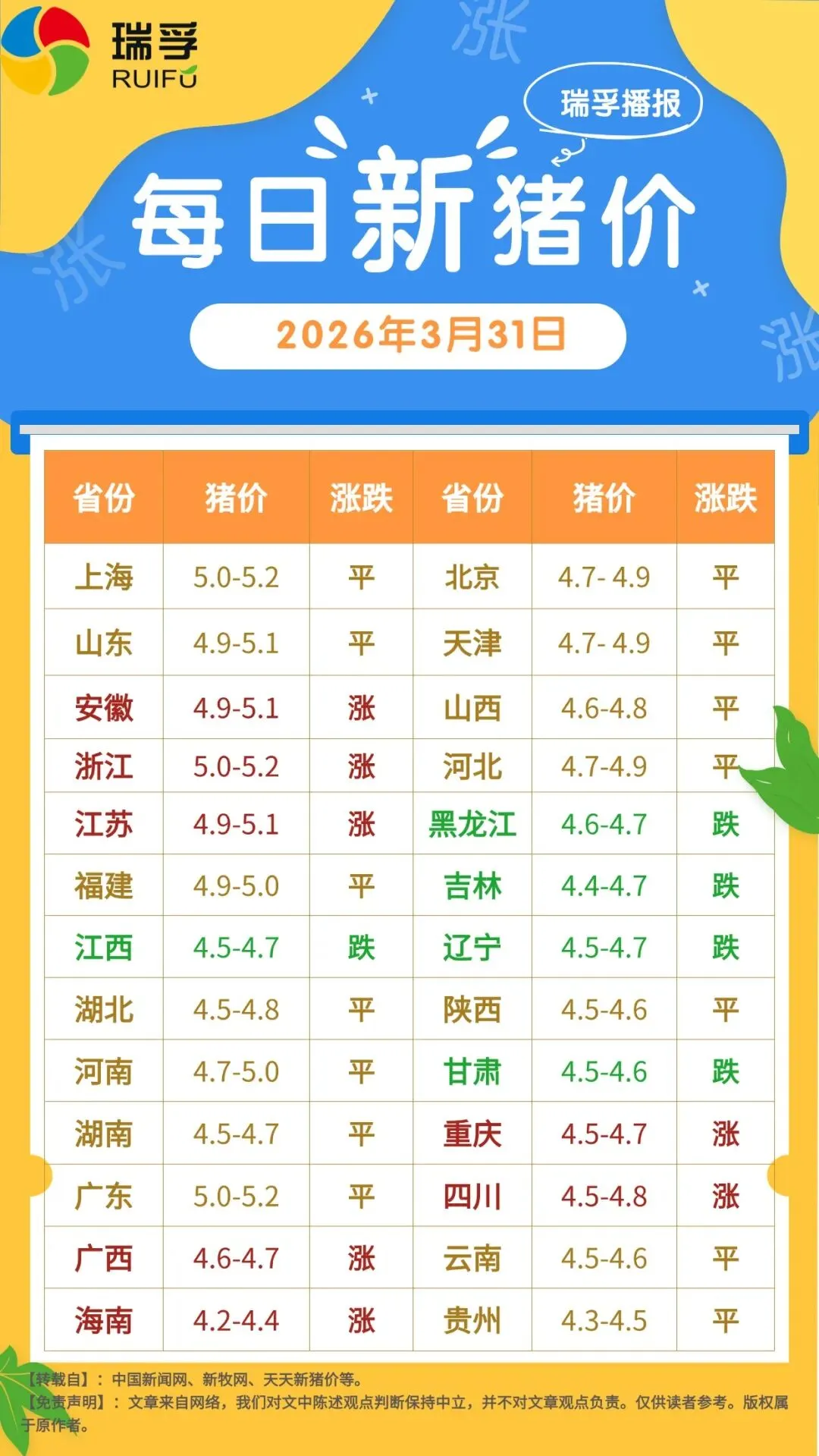 今日猪价 | 3月31日生猪价格 养羊网 2026-03-31 今日猪价 | 3月31日生猪价格编辑|瑞孚集团企划中心 养羊网 2026-03-31 上一篇:【今日猪价】2026.3.31:猪价呈现一定止跌回暖的走势 下一篇:贵州遵义鸡蛋价格:3月31日 您可能还会对下面的文章感兴趣111: 相关文章 【明日猪价】2026-1-22全国生猪价格(猪价大范围下跌) 近期价格更新!!! 卖羊了,本地正宗黑山羊 贵州必吃榜单??