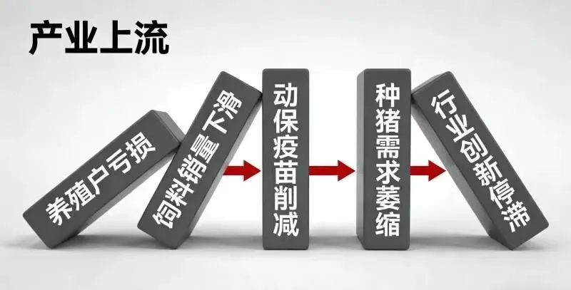 这种需求萎缩的连锁反应,就像多米诺骨牌,从终端消费,一路传导到产业链的最上游。而处于中上游的这些企业,因为账期长、库存大、固定成本高,往往比养殖户更难转身。