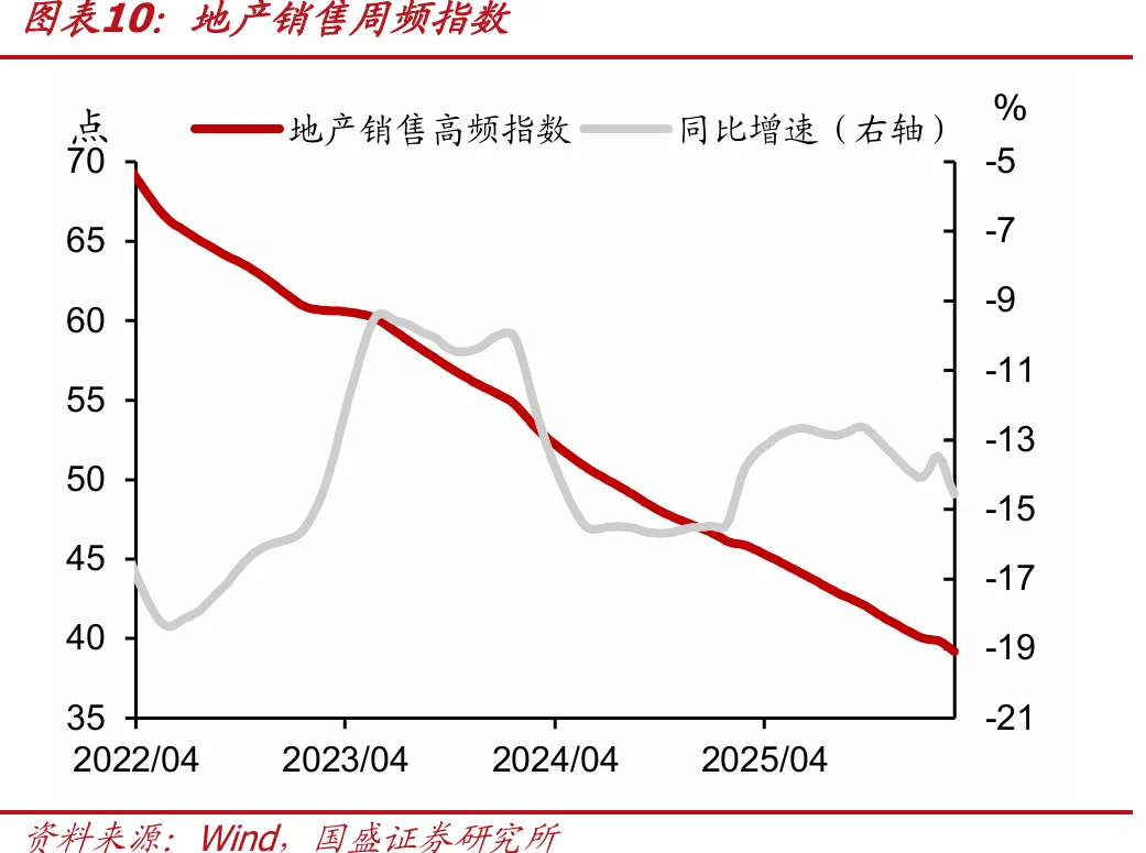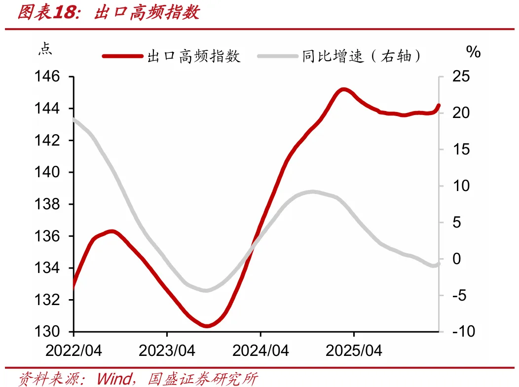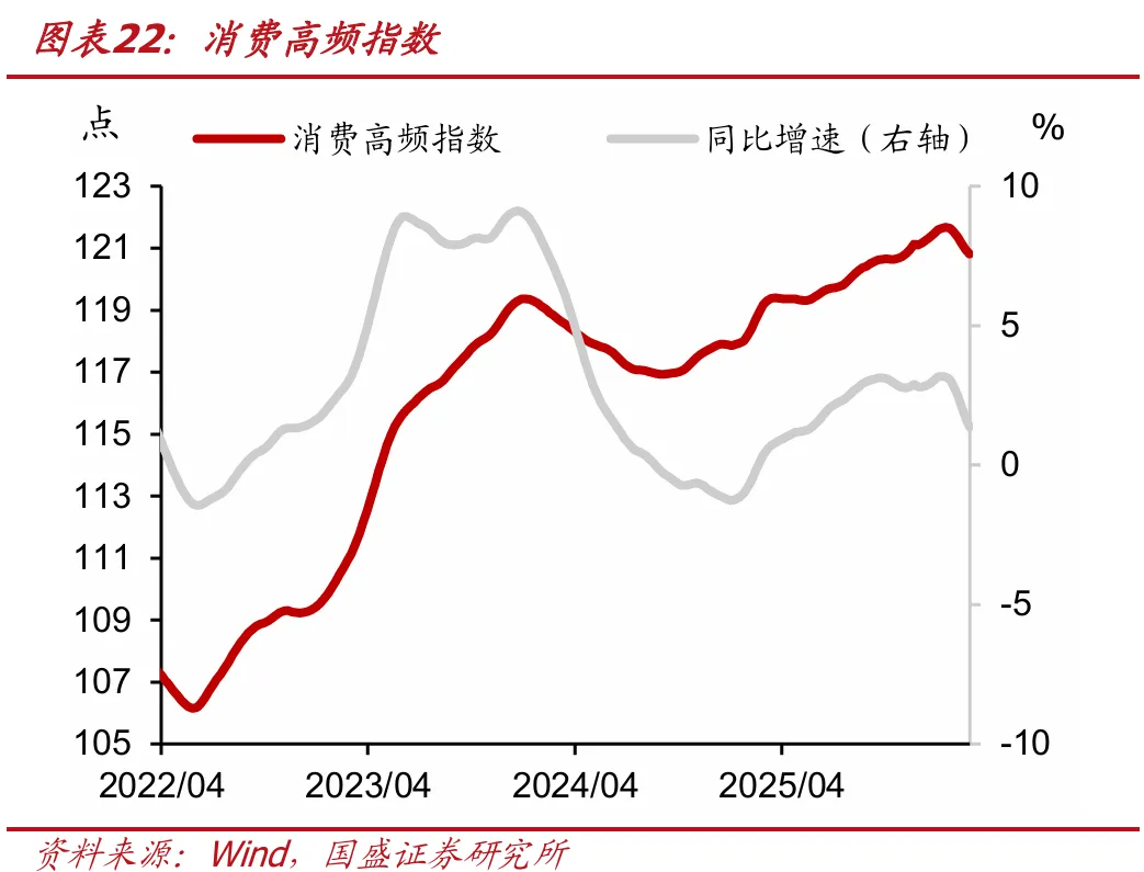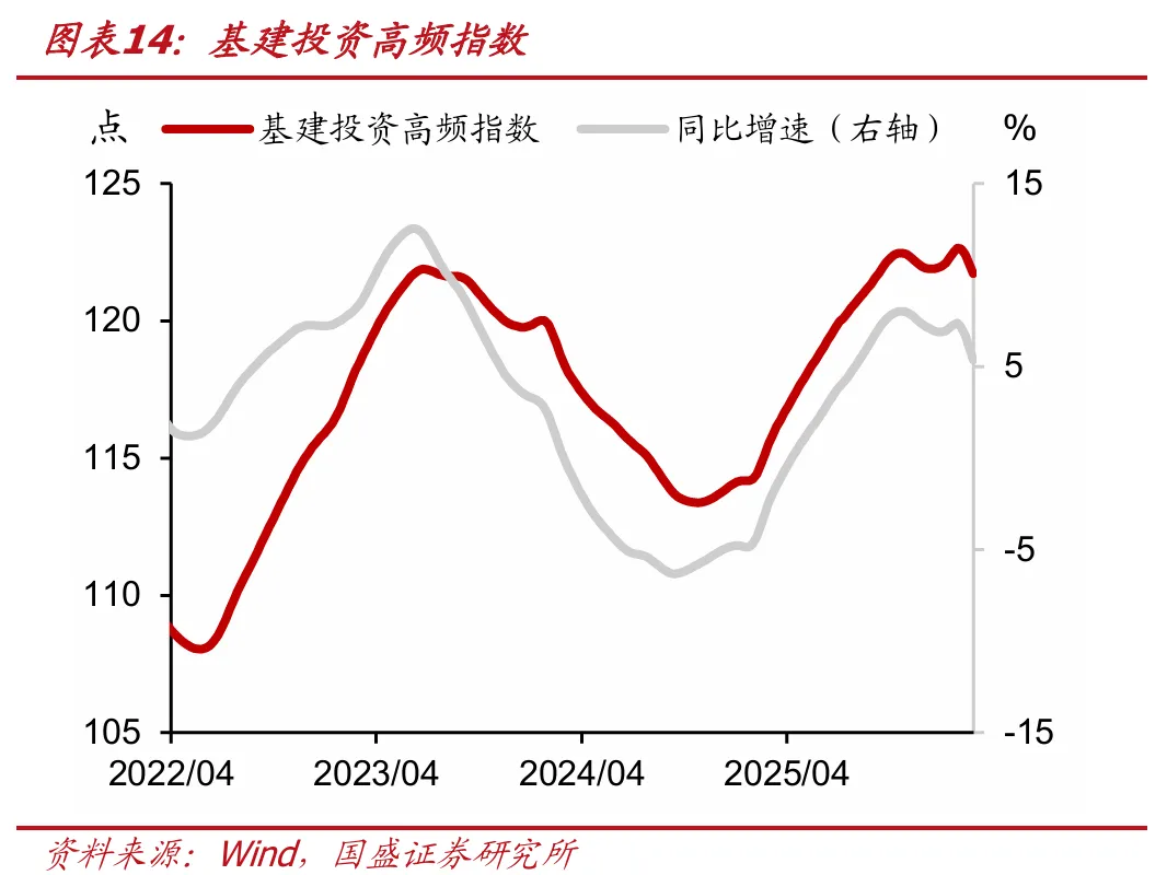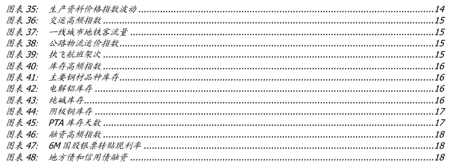 总需求方面,商品房销售高频指数为39.2,前值为39.4,当周同比下降6.7点(前值为下降6.6点),同比降幅扩大;基建投资高频指数为121.7,前值为122.1,当周同比增加6.2点(前值为增加7.0点),同比增幅回落;出口高频指数为144.2,前值为144.0,当周同比减少1.0点(前值为减少1.2点),同比降幅减少;消费高频指数为120.8,前值为121.0,当周同比增加1.6点(前值为增加2.0点),同比增幅回落。