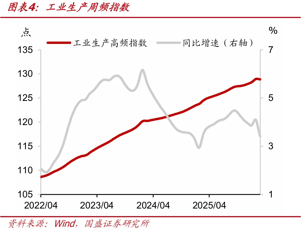 生产方面,工业生产高频指数为128.9,前值为128.9,当周同比增加4.3点(前值为增加4.5点),同比增幅回落。