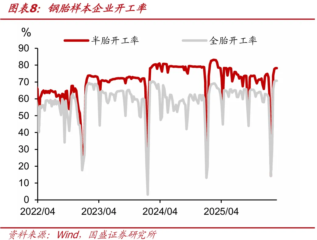 电炉开工率为62.8%,前值为60.9%;聚酯开工率为87.5%,前值为86.3%;半胎开工率为78.2%,前值为78.3%;全胎开工率为70.8%,前值为70.7%;PX开工率为87.7%,前值为86.6%。