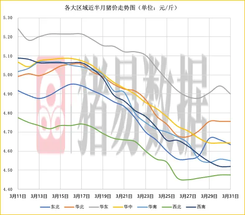 东北、华东、华南地区猪价呈现下跌,西北、华北、华中、西南地区猪价呈现稳定,生猪平均价格微跌。