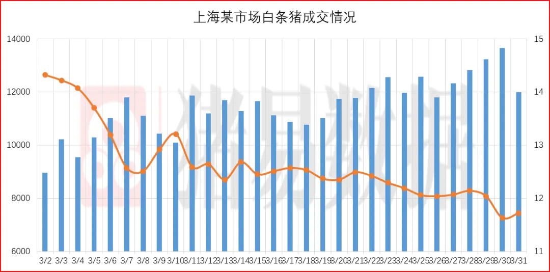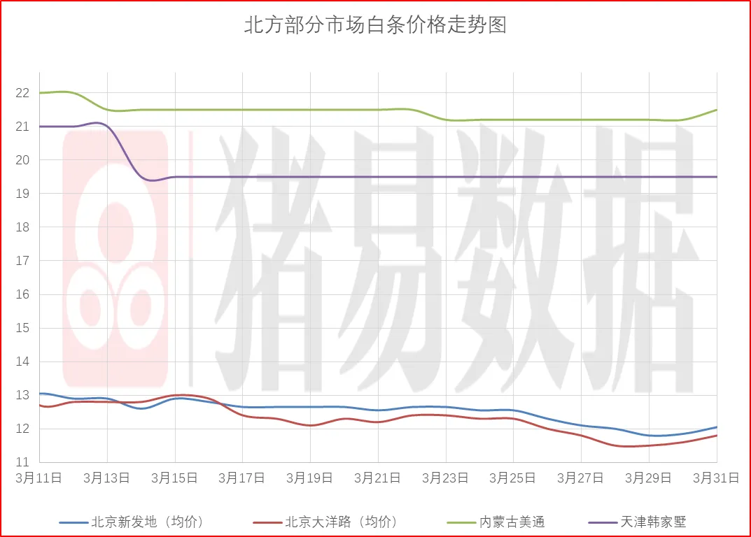 从今日北京、上海消费城市批发市场白条价格走势来看,北京、上海批发市场白条开磅价格呈现稳中伴涨,北京大部分市场开磅价格维持稳定,市场走货速度表现偏好;上海市场价格呈现上涨,部分市场成交价参考11.22-11.72元/公斤,到货量表现有所减少,市场交易情况表现一般偏好,市场成交均价表现偏好。