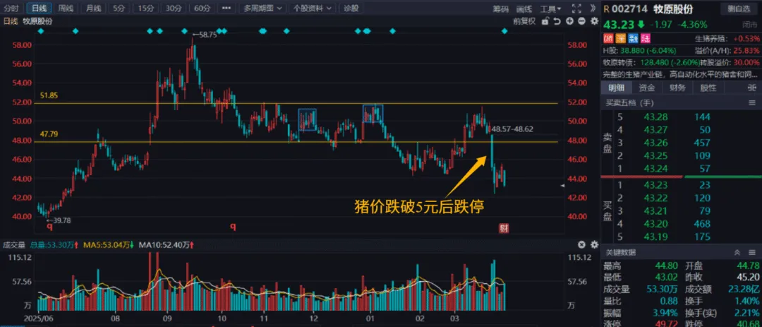 猪价暴跌原因 1.产能过剩,能繁母猪存栏量达3961万头,超出国家调控目标(3650万头)8.5%(产能过剩导致供需失衡是本质) 2.猪企故意打价格战,国内猪养殖业几家龙头公司在卷价格。现在售价低于所有公司成本,谁先撑不住谁就把市场贡献出来。(国内龙头牧原股份年初去港股上市融资了百亿,明牌搞死全行业) 3.国家可能有意识压低猪价,全球动荡下压低猪价压低生活成本,便于社会稳定(猜测) 股价 牧原股份本来上半年有望进入猪周期上升阶段的 但由于猪价跌破5元后,猪价要等下半年才有主升可能性了