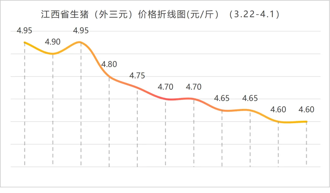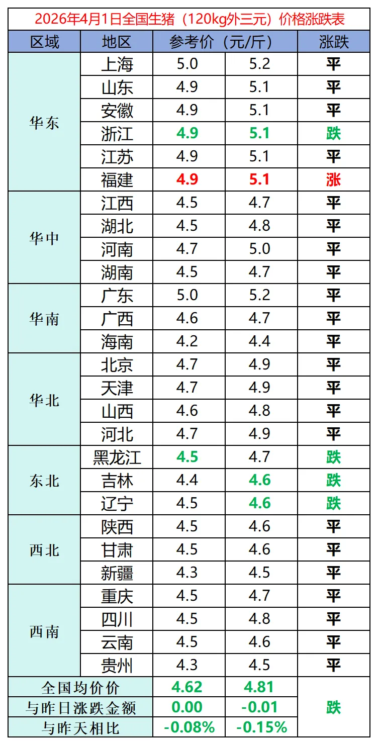 ? ? ?4月1日,2026年第一季度刚刚收官,国内生猪市场仍在低位徘徊。今日全国外三元标猪出栏均价约为4.65-4.70元/斤区间,较昨日整体持稳,但多地呈现弱稳态势。从区域看,广东、上海维持在5.0-5.2元/斤,为全国高价区;新疆、海南仍在4.2-4.4元/斤的低位运行;东北地区吉林、辽宁、黑龙江小幅下跌至4.4-4.7元/斤。整体来看,猪价在跌破5元/斤关口后已持续低位运行近两周,市场陷入“跌不动、涨不起”的僵持格局。