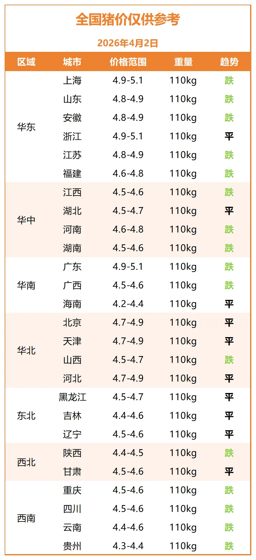 明日猪价早知道~全国大部分地区猪价下跌,有10个地区的猪价持平! 养羊网 2026-04-01 明日猪价早知道~全国大部分地区猪价下跌,有10个地区的猪价持平!猪价播报2026年4月2日全国猪价播报全国猪价播报~END~长按识别二维码关注我们 养羊网 2026-04-01 上一篇:定了!2026猪价走势已锁死!屠宰量狂增40%,猪市彻底炸锅! 下一篇:明日猪价【2026年4月2日】全国猪价来啦! 您可能还会对下面的文章感兴趣111: 相关文章 近期价格更新!!! 因为天天只买几块钱的肉被菜市场的猪肉佬蛐 2025年4月13日全国各地生猪价格信息 NYC的蛋