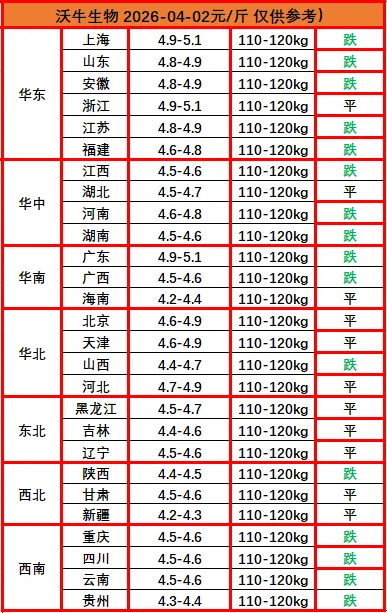 ? ?猪价播报沃小牛,助力养猪牛牛牛!各位养猪的老铁们,大家好!我是沃小牛,明天是2026年04月02日,最新猪价已经出来了:明日全国猪价整体延续震荡走弱态势,多地价格持平或下跌,市场缺乏明确上涨动力。华东地区多在4.8-5.1元区间,且多数呈下跌趋势;华南区域价格下滑;华北、东北及西南地区也整体偏弱,京津冀等多省市价格维持平稳或下跌,仅少数区域略有波动。当前行业产能仍处相对高位,消费端复苏乏力,市场供需博弈持续,猪价难有突破行情,预计明日行情仍将延续震荡偏弱格局,局部区域或随供需变化小幅波动。