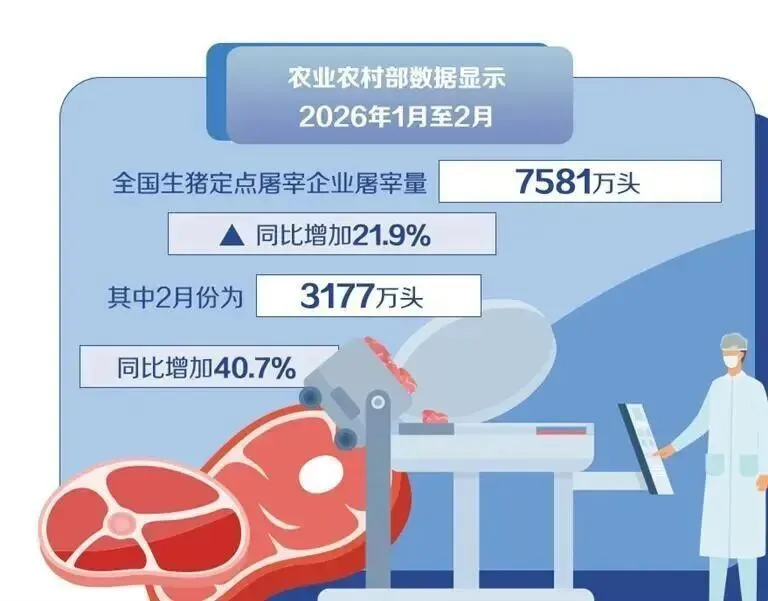 从供给端看,生猪出栏量持续处于高位。朱增勇表示,2025年上半年全国能繁母猪存栏持续处于高位,叠加生产效率提升,三季度新生仔猪量惯性增长,2026年一季度生猪供应充裕。农业农村部数据显示,2026年1月至2月,全国生猪定点屠宰企业屠宰量7581万头,同比增加21.9%,其中2月份为3177万头,同比增加40.7%。
