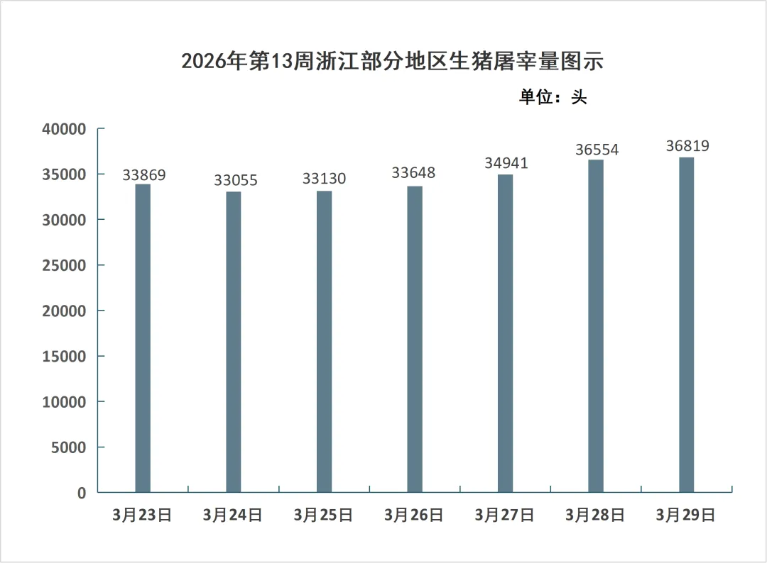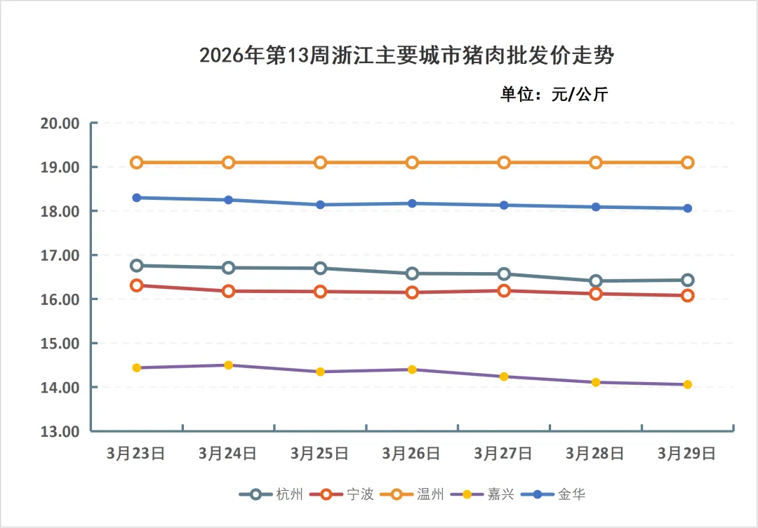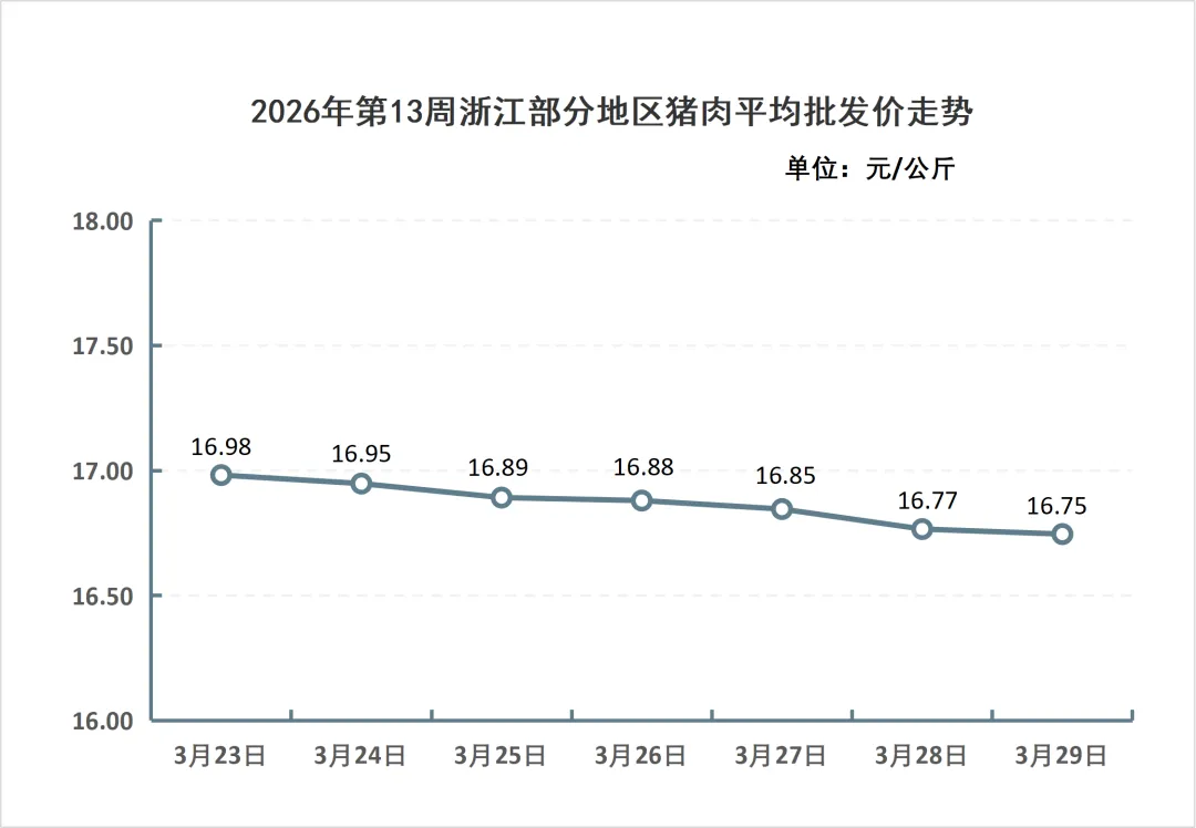 据浙江放心肉商情网对全省80家屠宰厂(场)日报监测统计,2026年第13周(3月23日-3月29日),全省生猪屠宰上市量24.20万头,生猪平均收购价为12.86元/公斤,猪肉平均批发价为16.87元/公斤。