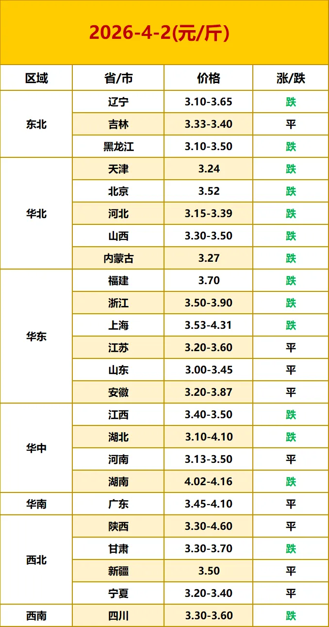 【鸡蛋价格】2026.4.2—最新鸡蛋价格 养羊网 2026-04-01 【鸡蛋价格】2026.4.2—最新鸡蛋价格点击蓝字关注我们吧~价格仅供参考 养羊网 2026-04-01 上一篇:4月1日浙江省猪价日报 下一篇:4月1号 最新鸡蛋价格速查 您可能还会对下面的文章感兴趣111: 相关文章 2025年10月24日早间鸡蛋价格参考价 鸡蛋价格早报 2026年3月2日-最新猪价 平度周围有没有需要羊的