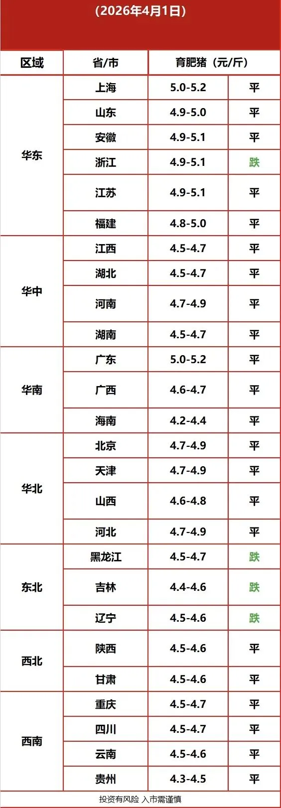 4月1日猪价 养羊网 2026-04-01 4月1日猪价每日猪价行情4月1日猪价点点赞推 荐 阅 读中东战火如何烧高我们的猪饲料?养猪人必看的成本预警!真金白银!温氏股份拟最高12亿回购,向市场释放最直接信号美国大豆想回中国餐桌?13%关税挡路,巴西笑了www.chinabreed.com中国养殖网编辑:郑高兴来源:中国养殖网、网络 养羊网 2026-04-01 上一篇:2026年4月2日全国猪价最新走势 下一篇:最新猪价 | 4月2日猪价预测:下行 您可能还会对下面的文章感兴趣111: 相关文章 今日玉米价格5-12 2026年2月26日鸡蛋价格信息 明日(1月9日)鸡蛋价格预测 双十一后的,第一波好物分享??
