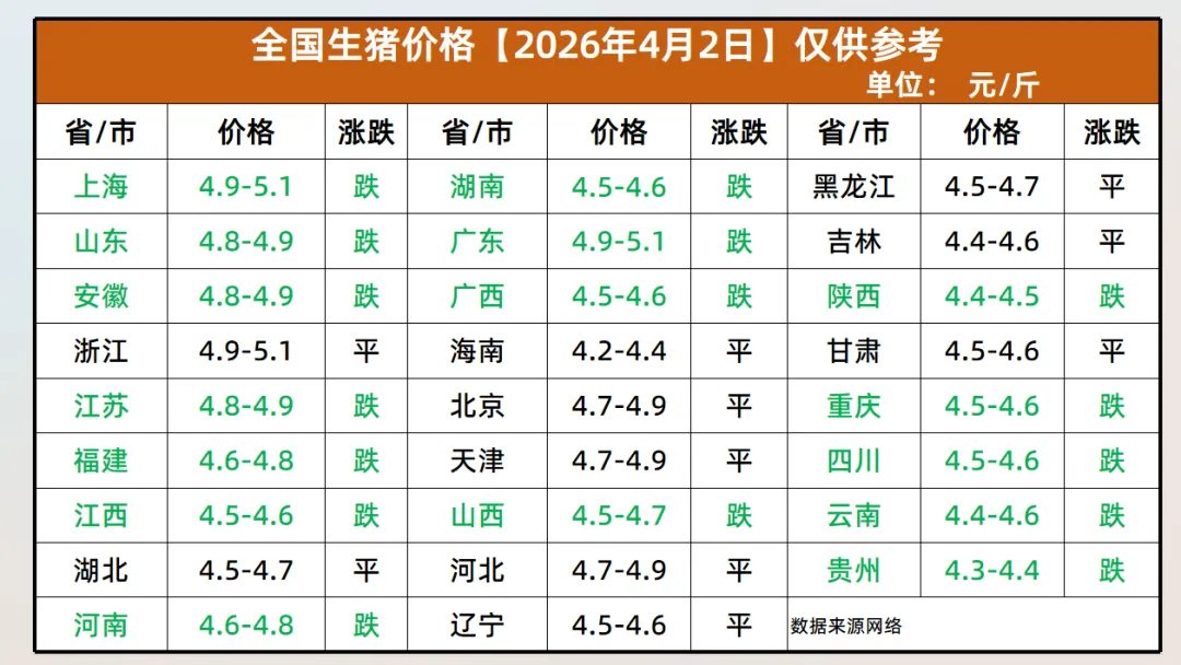 4 月 2 日猪价以低位震荡、局部微跌为主,整体呈 “大部企稳、区域分化” 格局,主流支撑暂难大幅破位。