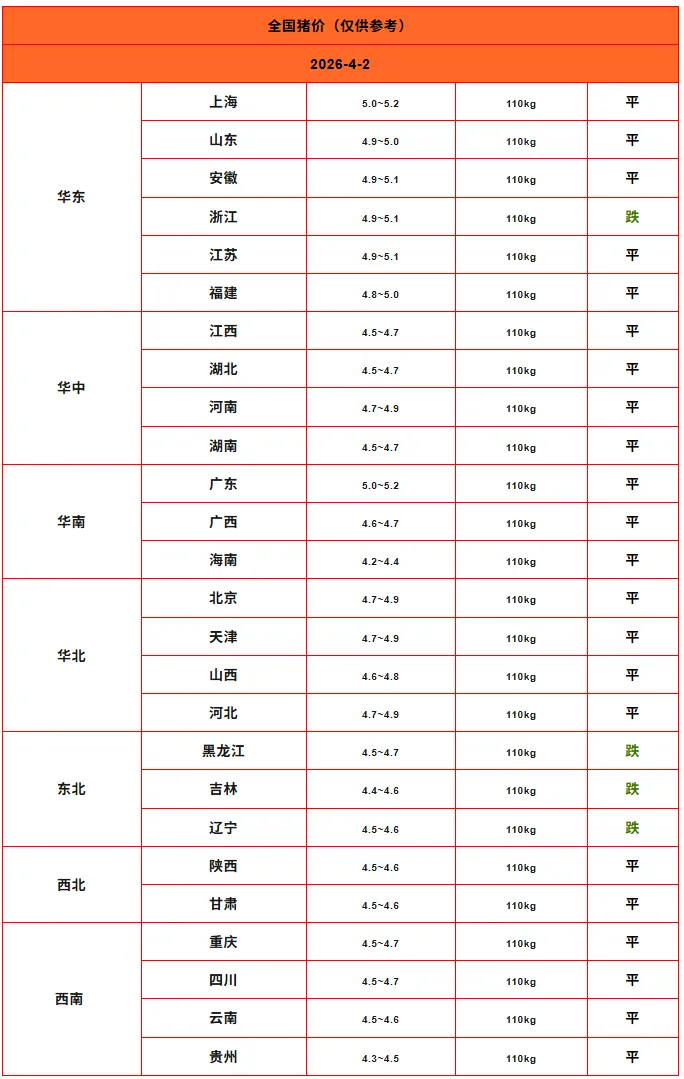 2026年04月02日全国猪价行情表 养羊网 2026-04-01 2026年04月02日全国猪价行情表以上内容源于网络,如有侵权请与我们联系,将及时删除。来源丨 畜禽报价 养羊网 2026-04-01 上一篇:【明日猪价】2026.4.2全国猪价! 下一篇:东北猪价反弹!市场进入“磨底”期,后市怎么看?丨附明日4.2猪价 您可能还会对下面的文章感兴趣111: 相关文章 2025年4月13日全国各地生猪价格信息 来自于西北甘肃放养散养的山羯羊和羊羔 2025年,国家扶持的养殖项目主要集中在那几 2025年4月13日全国各地生猪价格信息